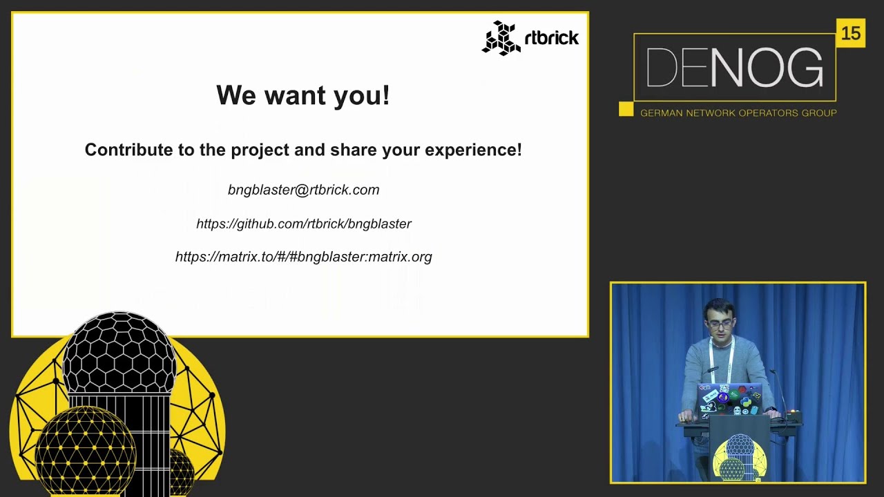 RtBrick's Christian Giese describes the latest updates for BNG Blaster, RtBrick's open-sourced BNG testing software, at DENOG (German Network Operators Group)